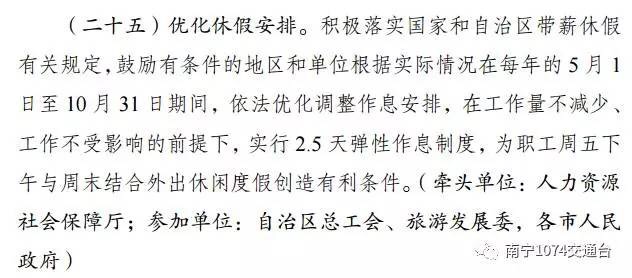 要优化休假安排。积极落实国家和自治区带薪休假有关规定,鼓励有条件的地区和单位根据实际情况在每年的5月1日至10月31日期间,依法优化调整作息安排,在工作量不减少、工作不受影响的前提下,实行2.5天弹性作息制度,为职工周五下午与周末结合外出休闲度假创造有利条件。