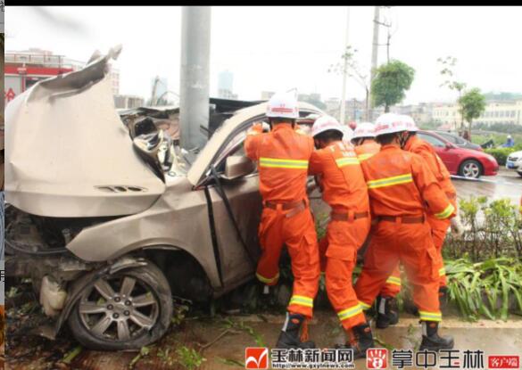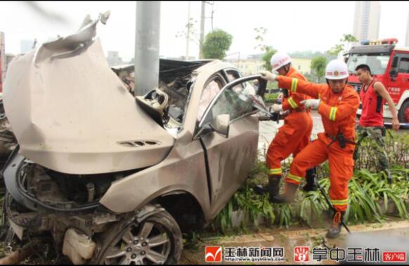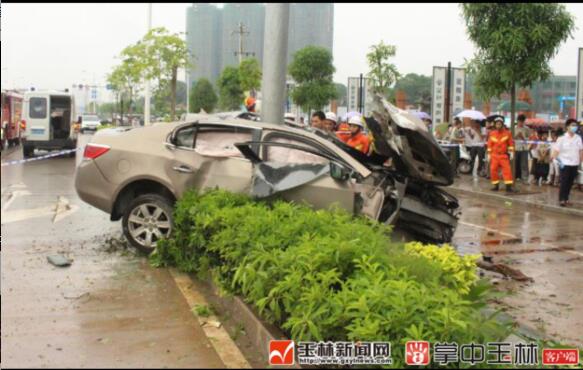 5月18日16时30分许,玉林城区金港路金色维也纳小区旁发生一起惨烈交通事故,一辆别克轿车失控撞上路边绿化带内的交通指示牌柱,轿车被拦腰折断,事故造成一死一重伤。事故发生后,玉林市消防部门立即前往紧急救援。