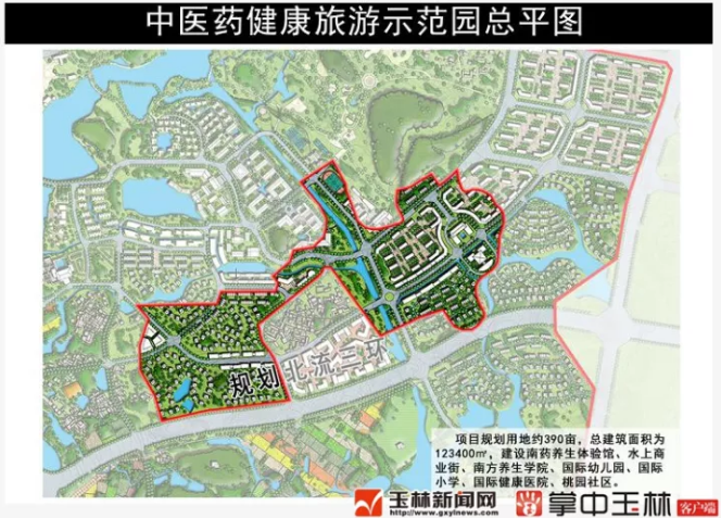 中医药健康旅游示范园是2017年广西壮族自治区层面统筹推进第一批增补计划的重大项目之一,是集中医药养生、休闲度假、康体疗养为一体的高品位养老、医疗生态休闲度假旅游景区。项目总投资约7亿元,占地面积261000㎡。项目主要建设包括桃源社区、南药养生体验馆、水上商业街、南方养生学院、国际幼儿园、国际健康医院、国际小学等及其他市政配套项目。建成后将会带动玉林市旅游、养老事业的快速发展。